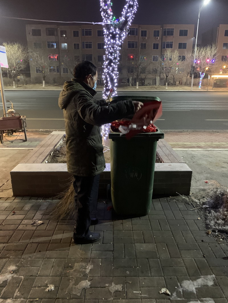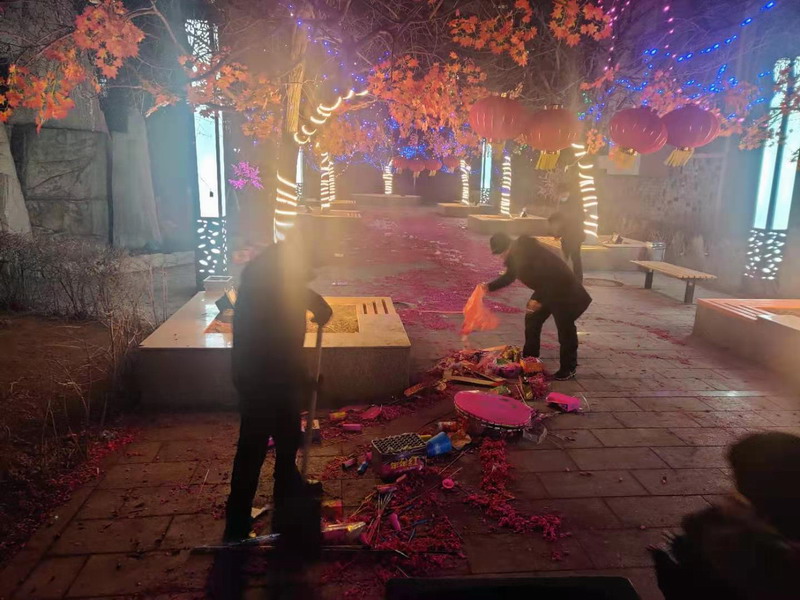 除夕夜燃放煙花爆竹是春節(jié)慶祝的方式,晚上十點,是物業(yè)人的集結(jié)令,當(dāng)大家都沉浸在過年的闔家歡樂的喜慶氛圍中,中天物業(yè)全體員工卻投入清掃的崗位中,是他們將轄區(qū)燃放的爆竹紙屑清掃的一塵不染。凡是有鞭炮紙屑的地方就有我們物業(yè)人的身影,微笑著穿梭在轄區(qū)的各個角落,他們彎身弓腰、揮掃裝袋。當(dāng)業(yè)主們初一清晨走入園區(qū)時,映入眼簾的仍然是干凈、整潔、安全的社區(qū)環(huán)境。