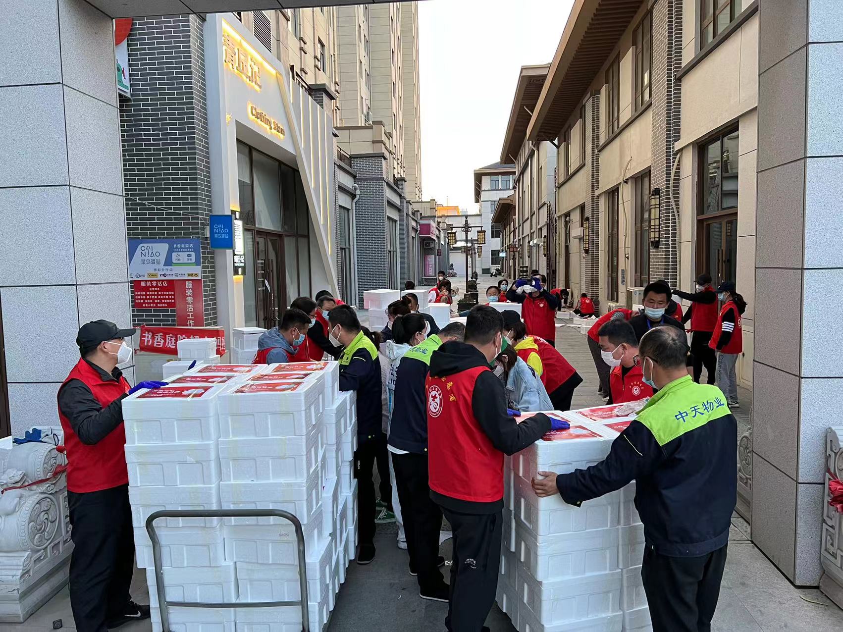 自全市實施社會面靜態(tài)管理以來,面對封控嚴格、采購不易的困難情況,如何能讓廣大封閉在家的業(yè)主生活的更踏實、更安心,如何能為廣大中天的家人們提供更好的服務,成為中天物業(yè)人的頭等大事。5月14日,經(jīng)過多方溝通協(xié)調,中天物業(yè)采購了大量的肉蛋蔬菜,為居住在中天旗下物業(yè)的每戶送上一份包含豬肉、雞蛋、黃瓜、豆角、茄子、蘑菇、辣椒、土豆、蒜薹、餃子共10種物資的禮包。從15日起,10輛物資配送車先后去往中天·御景華庭、中天壹品、中天尚品、中天·君臨天下、中天·桃花源、中天·御景灣、中天·御荷苑、中天·書香庭院、中天·英倫名邸,中天國際,中天大廈等11個營口住宅小區(qū),由物業(yè)員工和業(yè)主志愿者進行分裝,逐棟樓通知領取,將溫暖送到4萬多業(yè)主手中。