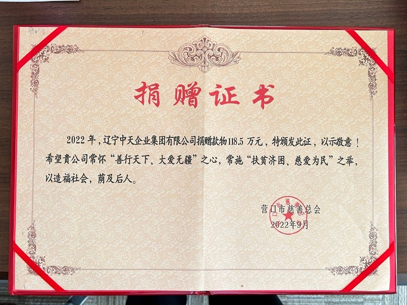 2022年,由于營口地區(qū)發(fā)生了新冠疫情,中天集團加大了愛心慈善捐助力量,先后兩次為營口慈善總會捐款90萬元,疫情期間捐贈抗疫物質(zhì)折合人民幣近10萬元,同時,繼續(xù)啟動“中天助學金”和“中天愛心物資發(fā)放”兩大愛心項目,為31名貧困家庭考入大學的學生捐資15.5萬元,為600戶貧困居民送去米面油折合人民幣10萬元,持續(xù)做好“獻愛心做慈善”的活動。