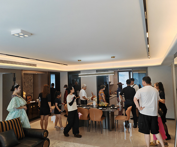 儀式現(xiàn)場(chǎng),熱情高漲的客戶早已匯聚于這座流光溢彩的東大門前。以名貴理石精工筑就、星空頂熠熠生輝、水幕墻靈動(dòng)瀉玉、噴泉水系恭迎貴賓的“星幕尊邸門”,其本身即是歸家尊崇儀式的開篇序章,成為令人矚目的視覺地標(biāo)。人群中,既有開盤即購(gòu)房的業(yè)主,滿懷憧憬前來借鑒設(shè)計(jì)靈感,為未來愛家描繪藍(lán)圖;亦有眾多意向濃厚的準(zhǔn)業(yè)主,翹首以盼親身體驗(yàn)升級(jí)品質(zhì),為理想生活尋覓最契合的空間載體。