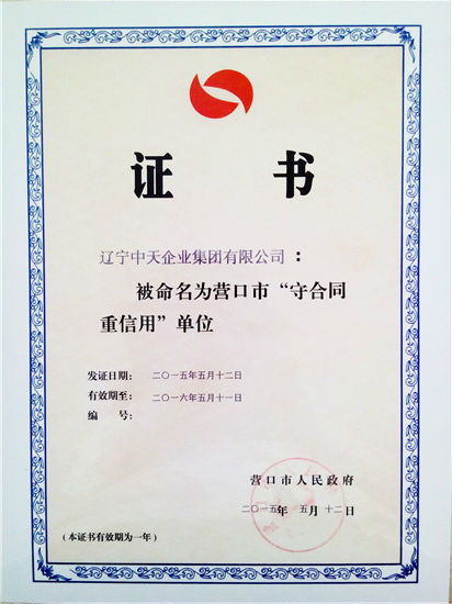 10、集團連續(xù)11年榮獲“守合同重信用”單位榮譽稱號。5月20日,集團再次被評為市“守合同重信用”單位,這是集團連續(xù)十一年獲此殊榮。這既是中天集團多年來一直堅持守合同重信用工作,以誠信推動企業(yè)發(fā)展的結果;又是對中天集團全體員工日常點點滴滴辛勤工作的溫情回報;更是社會各界對中天集團持續(xù)、穩(wěn)健發(fā)展的充分認可與贊揚。