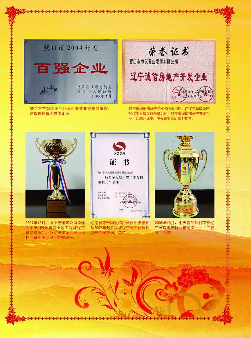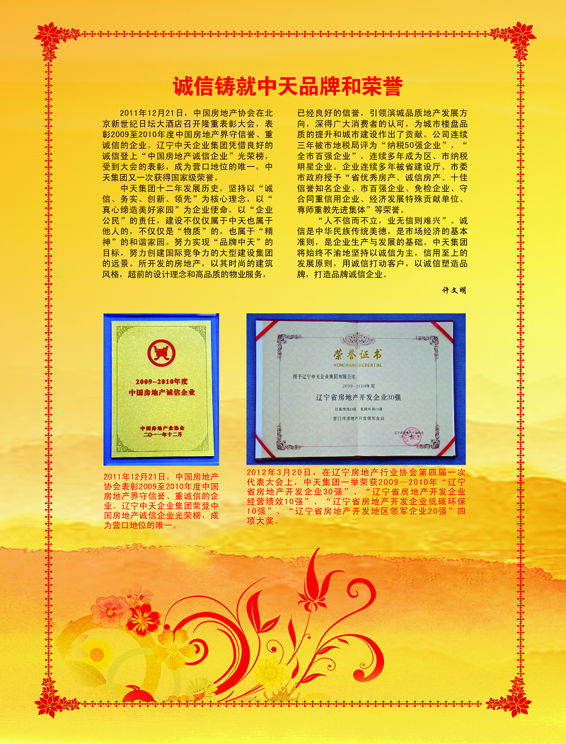 中天集團(tuán)連續(xù)十三載榮獲“市守合同重信用”企業(yè)榮譽(yù)稱號?!罢\實(shí)守信”是一個企業(yè)在激烈的市場競爭中保持旺盛生命力和競爭力的根本,是建立市場經(jīng)濟(jì)秩序的基石,是企業(yè)可持續(xù)長遠(yuǎn)穩(wěn)健發(fā)展的保障。中天集團(tuán)成立至今,已建立起自身獨(dú)特的“誠信機(jī)制”,對業(yè)主說到做到,對客戶說到做到,與主管政府部門領(lǐng)導(dǎo)說到做到,嚴(yán)格按合同履行各項(xiàng)責(zé)任與義務(wù),“共贏互利、信守承諾”得到了社會各界的一致認(rèn)可與好評,集團(tuán)也走出了屬于中天特色的發(fā)展之路。